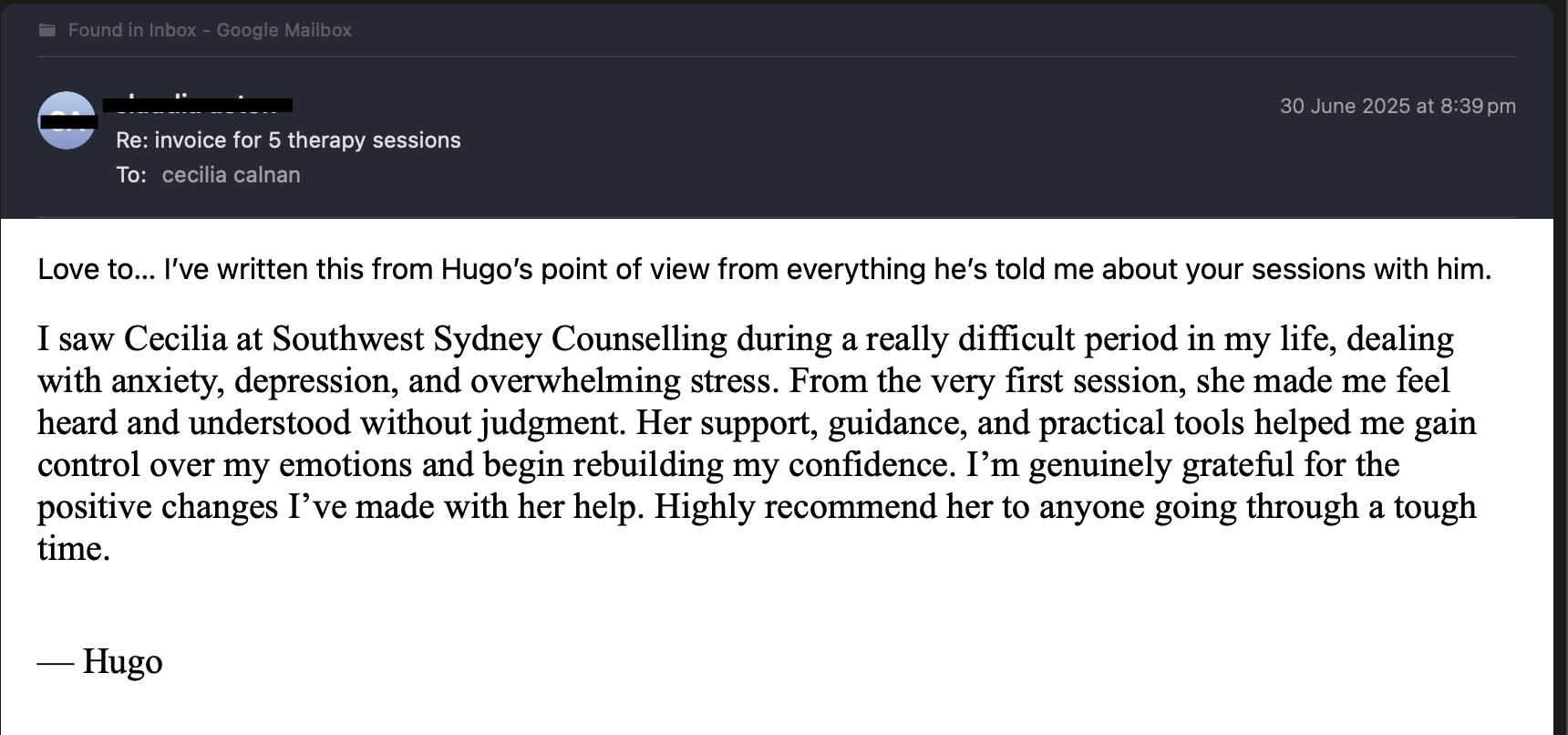 I saw Cecilia at Southwest Sydney Counselling during a really difficult period in my life, dealing with anxiety, depression, and overwhelming stress. From the very first session, she made me feel heard and understood without judgment. Her support, guidance, and practical tools helped me gain control over my emotions and begin rebuilding my confidence. I’m genuinely grateful for the positive changes I’ve made with her help. Highly recommend her to anyone going through a tough time.